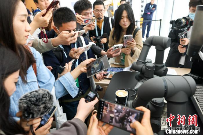 4月24日,记者探访位于北京的2024中关村论坛年会主会场——中关村国际创新中心。该中心建筑面积6.5万平方米,建筑高度12米,共三层。2024中关村论坛将首次在刚建成的中关村国际创新中心举办,时间定于4月25日至29日。今年论坛主题为“创新:建设更加美好的世界”。图为一款可以制作拉花图案的智能咖啡机器人。 中新社记者 贾天勇 摄