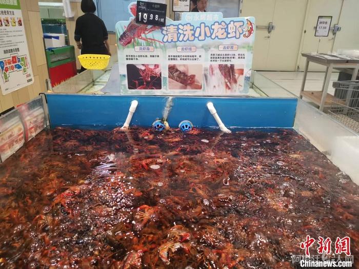 某超市里售卖的鲜活小龙虾。 中新网记者 谢艺观 摄