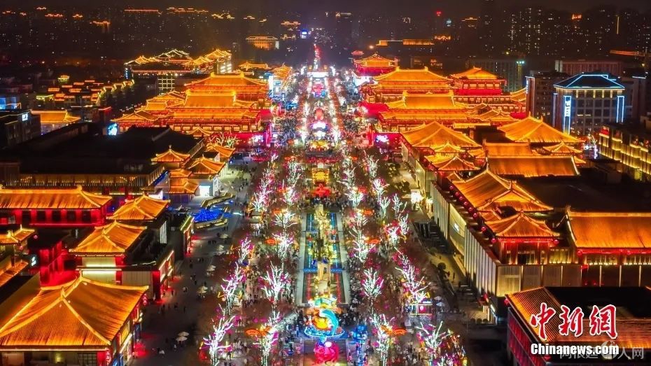 航拍西安大唐不夜城夜景,灯火璀璨流光溢彩。图片来源:ICphoto
