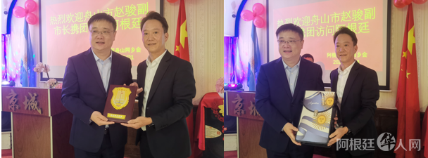 阿根廷华助中心严祥兴主任与浙江省舟山市副市长赵骏互赠纪念品