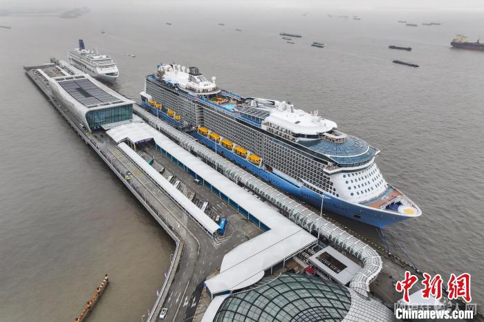 4月26日,超大国际邮轮“海洋光谱号”回归阔别4年多的上海母港。(资料图,无人机照片) 中新社记者 张亨伟 摄