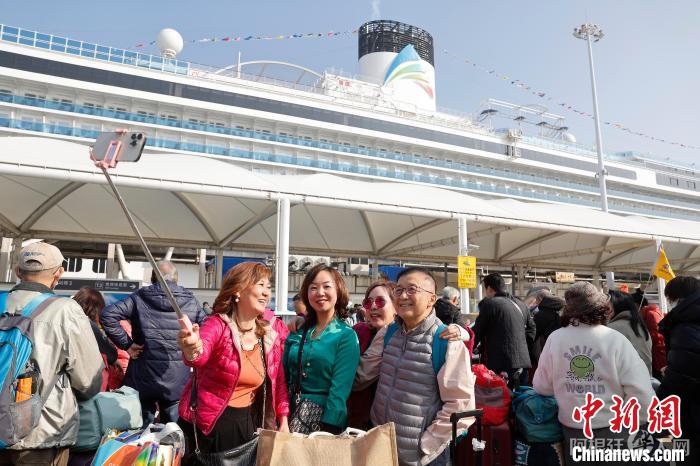 1月1日,来自新加坡的游客在上海吴淞口国际邮轮港与爱达·魔都号邮轮合影。(资料图) 中新社记者 殷立勤 摄