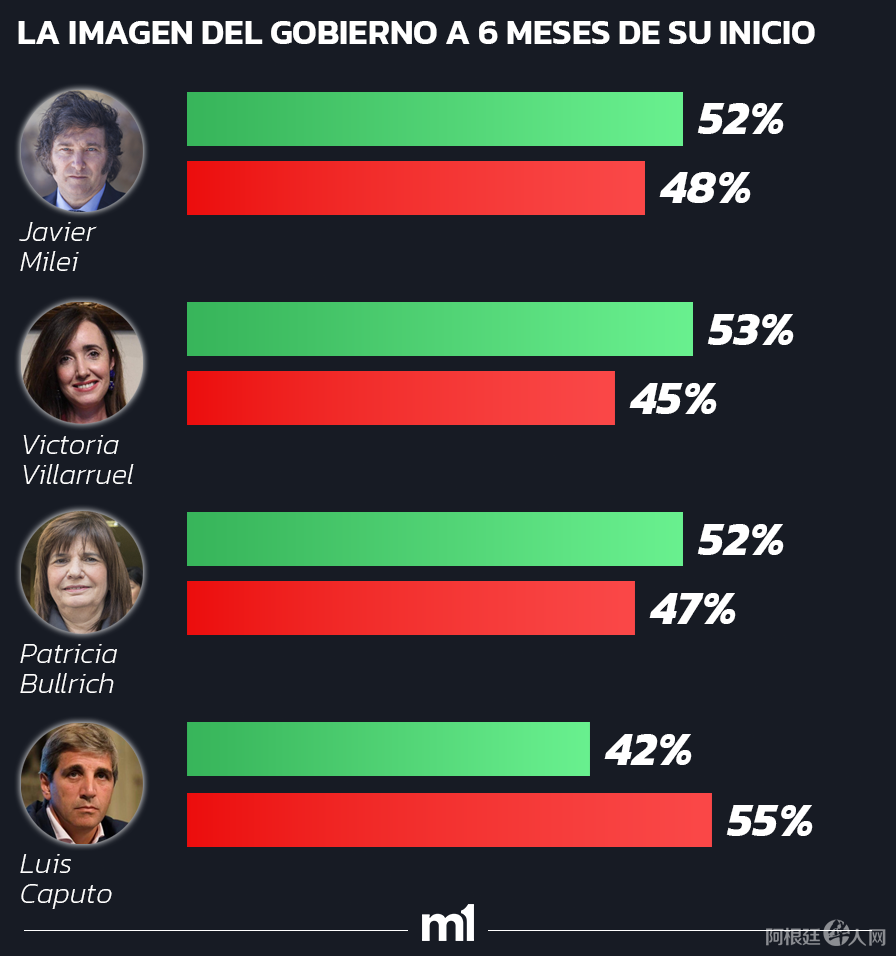 调查显示,米莱政府的支持率约为46%,反对派的支持率为40%,还有14%的受访者没有做任何选择。与此同时,副总统维拉鲁尔的正面形象为53%,负面形象为45%;安全部长布里奇则分别为52%和47%;经济部长分别为42%和55%。
