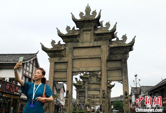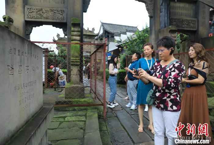 7月5日,来自19个国家的24家华文媒体来到“中国石牌坊之乡”四川隆昌,漫步在巴蜀古驿道,感受独特的“牌坊文化”。图为海外华文媒体代表在南关石牌坊古镇参观拍摄。中新社记者 王磊 摄