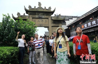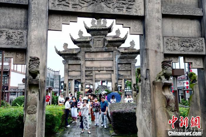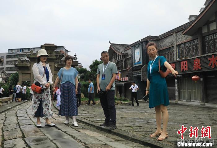 7月5日,来自19个国家的24家华文媒体来到“中国石牌坊之乡”四川隆昌,漫步在巴蜀古驿道,感受独特的“牌坊文化”。图为海外华文媒体代表在南关石牌坊古镇参观。中新社记者 王磊 摄