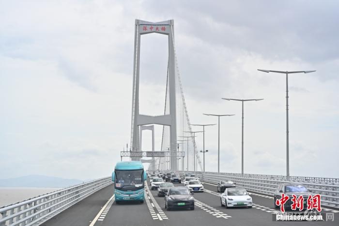 资料图:6月30日15时,历经逾7年的建设,粤港澳大湾区核心工程深中通道通车试运营。图为广东中山,车辆行驶在深中大桥上。中新社记者 陈骥旻 摄