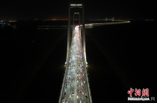 6月30日晚,广东中山,深中通道上车流密集。当日,历经逾7年的建设,粤港澳大湾区核心工程深中通道正式通车试运营。(无人机照片)中新社记者 陈骥旻 摄
