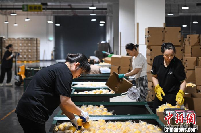 7月8日,在位于重庆潼南的雪王农业(重庆)有限公司,工人在打包柠檬鲜果。当日,“行走中国·2024海外华文媒体川渝行”参访团一行走进重庆市潼南区,实地了解当地柠檬产业发展。据悉,重庆潼南是世界三大柠檬产地之一,柠檬种植面积达32万亩,柠檬鲜果及柠檬产品远销俄罗斯、新加坡、东南亚等30多个国家和地区。近年来,“潼南柠檬”从技术研发、种苗培育、标准化种植、精深加工等为一体的柠檬全产业链在当地日臻完善。中新社记者 何蓬磊 摄