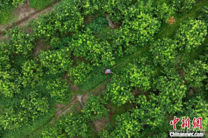 7月8日,重庆潼南,工作人员在柏梓镇小岭村柠檬基地除草。当日,“行走中国·2024海外华文媒体川渝行”参访团一行走进重庆市潼南区,实地了解当地柠檬产业发展。据悉,重庆潼南是世界三大柠檬产地之一,柠檬种植面积达32万亩,柠檬鲜果及柠檬产品远销俄罗斯、新加坡、东南亚等30多个国家和地区。近年来,“潼南柠檬”从技术研发、种苗培育、标准化种植、精深加工等为一体的柠檬全产业链在当地日臻完善。(无人机照片)中新社记者 何蓬磊 摄