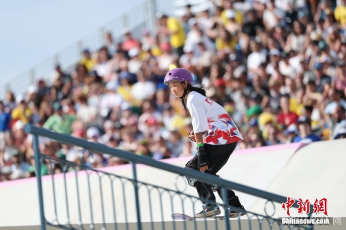 当地时间7月28日,巴黎奥运会滑板女子街式赛决赛在巴黎协和广场进行,中国14岁小将崔宸曦以241.56分的成绩排名第四,创中国滑板奥运最好成绩。图为崔宸曦在比赛中。中新社记者 盛佳鹏 摄