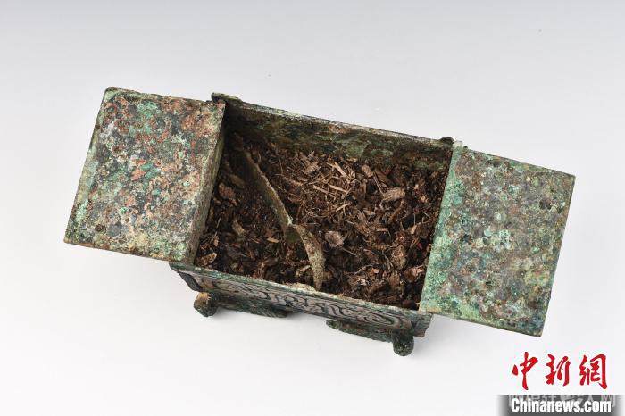 山西省运城市垣曲县北白鹅墓地出土的铜质化妆品盒。(山西省考古研究院供图)
