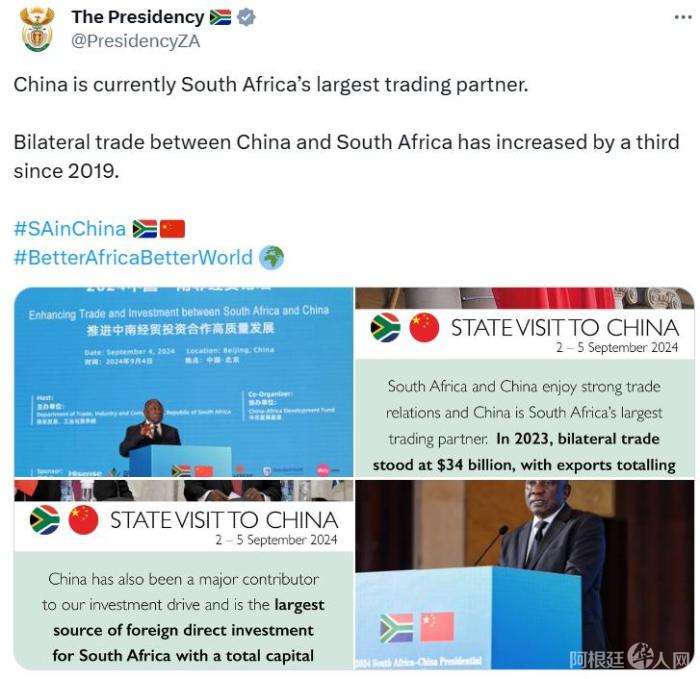 南非总统官方账号也在峰会期间发文称,中国目前是南非最大的贸易伙伴,南非和中国拥有充满活力、多元和不断增长的经济,能够为希望开拓新市场的企业提供丰富机遇。