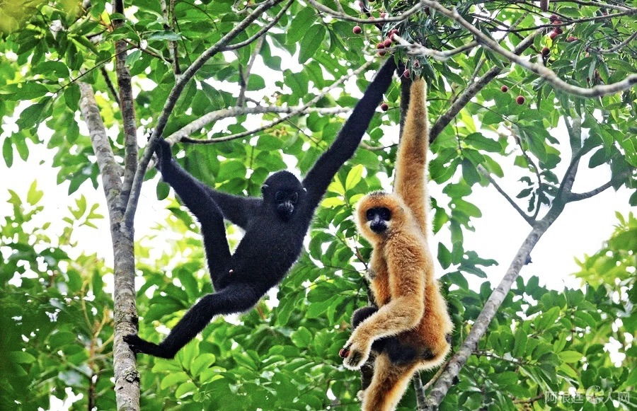 在海南霸王岭自然保护区热带雨林中,左图为树龄1130年的红花天料木。右图为“根抱石”现象。骆云飞摄(拼图)