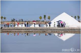 (图为海南莺歌海盐场吸引大批游客前来。)