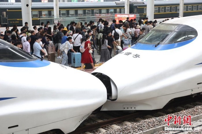 9月30日,江苏南京,旅客们在火车站出行。当日,长三角铁路迎来国庆黄金周节前出行大客流,预计发送旅客338万人次,对客流饱满方向增开467列旅客列车满足高峰客流出行需要。今年国庆黄金周运输期限自9月29日起至10月8日止,共计10天。中新社记者 泱波 摄