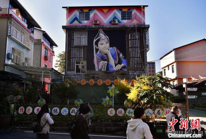 12月3日,在中国少数民族特色村寨——福建省漳州市华安县官畲村内,色彩斑斓的畲族民风墙绘成为村中一景。中新社记者 张斌 摄