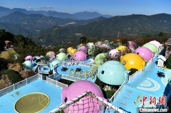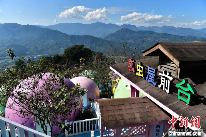 12月3日,在中国少数民族特色村寨——福建省漳州市华安县官畲村内,色彩斑斓的“瓢虫屋”民宿“挂”在高高的山坡上,成为游客来此住宿的首选。中新社记者 张斌 摄