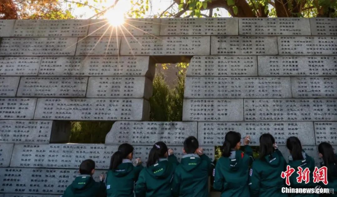 2024年12月1日,一群孩子在纪念馆“哭墙”前为南京大屠杀死难者的姓名描新。中新社记者 泱波 摄