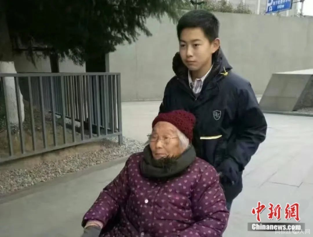 少年时期的蒋秉錞推着坐在轮椅上的曾祖母陈桂香,到侵华日军南京大屠杀遇难同胞纪念馆参加活动(资料图)。2024年3月5日,陈桂香去世,享年99岁。蒋秉錞 供图