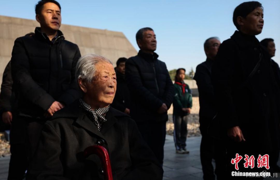 今年12月1日,在侵华日军南京大屠杀遇难同胞纪念馆遇难者名单墙前,南京大屠杀幸存者夏淑琴(左三)在外孙女夏媛(左二)等家属的陪同下,参加南京大屠杀死难者家庭祭告活动。中新社记者 泱波 摄