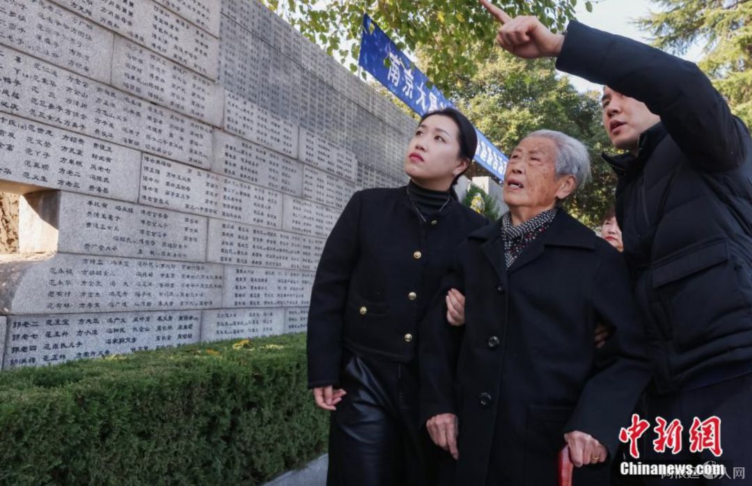 12月1日,年过九旬的南京大屠杀幸存者艾义英在家人的陪同下,在侵华日军南京大屠杀遇难同胞纪念馆遇难者名单墙前,看一看遇难亲人的名字。中新社记者 泱波 摄