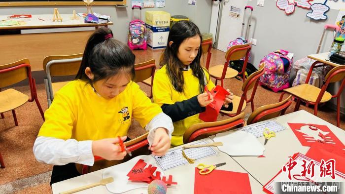当地时间12月9日,“中华文化大乐园—帕多瓦营”走进中意国际学校,图为学生们在学习剪纸。(受访者 供图)