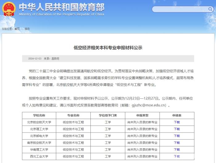 12月23日,教育部网站公示了低空经济相关本科专业申报材料,北京航空航天大学、北京理工大学、北京邮电大学、南京航空航天大学、华南理工大学、西北工业大学6所高校申请增设“低空技术与工程”新专业。