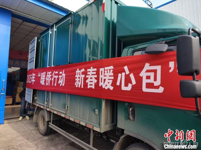 载着安徽省2025年“暖侨行动、新春暖心包”的车辆开出。安徽省侨办供图