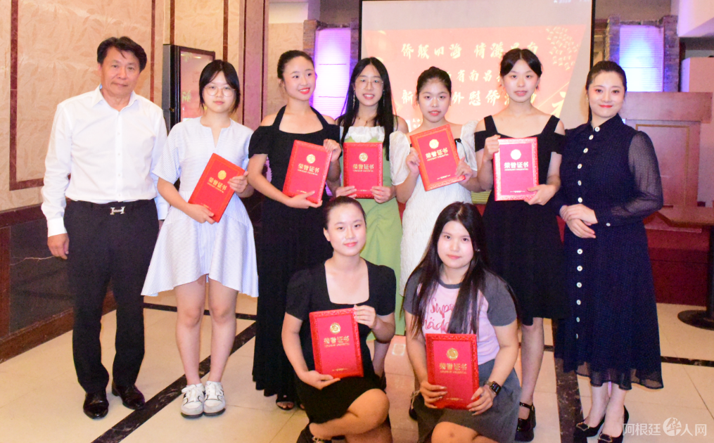 阿根廷华文教育基金静雅艺术中心主任吴靖和阿根廷洪门协会会长尤震为 2024 年度“艺术成就奖”获奖者何嘉鑫、陈娜娜、林佳佳、徐亦菲、郑欣意、林慧慧、张心瑶颁发获奖证书。