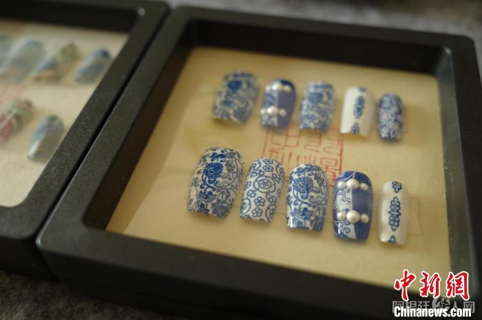 武汉姑娘杨帆制作的青花美甲。中新社记者 武一力 摄