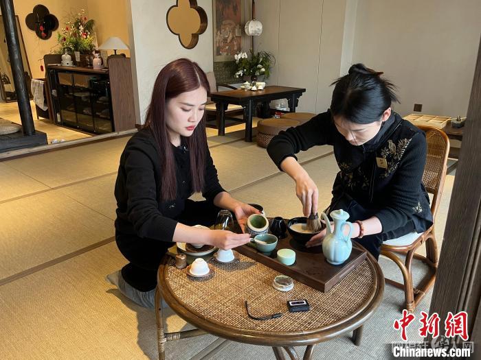 1月6日,湖北武汉,设计师马晓月(左)和茶艺师正在进行仿宋点茶。中新社记者 武一力 摄