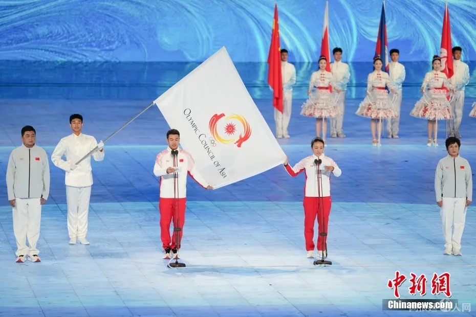 2月7日,第九届亚洲冬季运动会开幕式在哈尔滨举行。图为中国速度滑冰运动员宁忠岩、单板滑雪运动员蔡雪桐代表全体运动员宣誓。中新社记者 赵宇航 摄