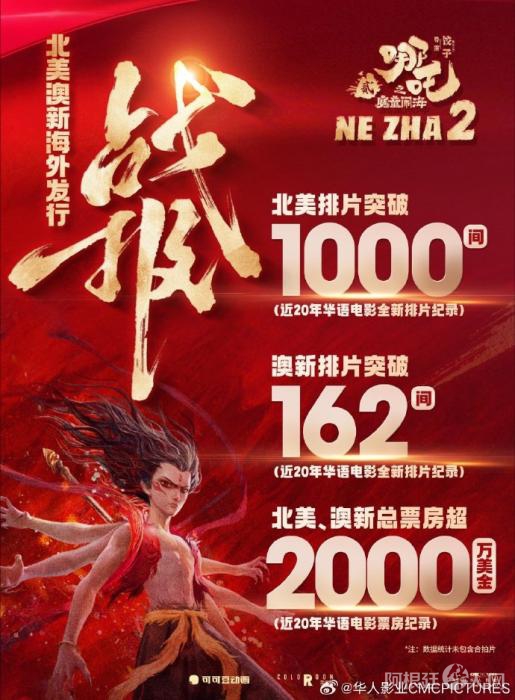 据介绍,目前北美有超1000家影院上映,澳大利亚、新西兰有162家影院上映,断层式刷新近20年华语电影海外最高排片纪录。票房方面,北美和澳新突破2000万美元,仅首周末票房打破近20年华语电影(非合拍片)票房纪录。