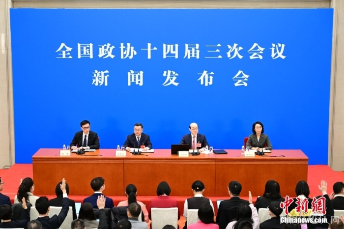 3月3日,全国政协十四届三次会议新闻发布会在北京人民大会堂举行。大会新闻发言人刘结一向中外媒体介绍本次大会有关情况并回答记者提问。中新社记者 田雨昊 摄