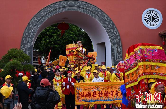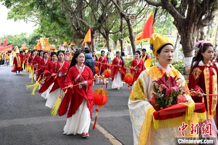 图为启动仪式后,各地妈祖文化团体代表前往天后殿参加三献礼仪式。中新社记者 吕明 摄