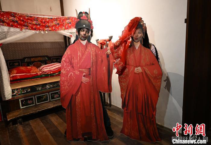 图为3月29日,狄杰与爱人在湄洲岛天妃故里遗址公园内的古代婚房景点拍照打卡。吕明 摄