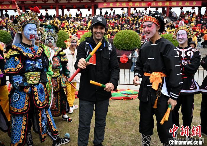 图为3月29日,狄杰在湄洲岛参加“天下妈祖回娘家”启动仪式并与英歌舞表演队互动。吕明 摄
