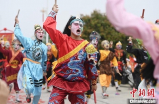 3月14日,广东揭阳普宁桥柱珠光民俗文化节举行。图为英歌舞表演。中新社记者 陈楚红 摄