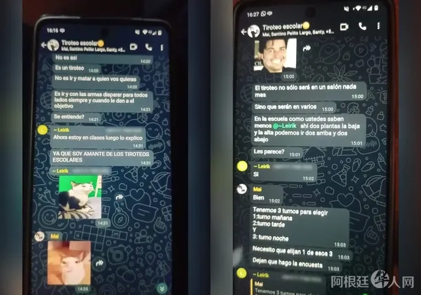 据媒体报道,上述4名学生组建了一个WhatsApp群组,取名“校园枪击”,在里面讨论组织一次校园枪击。其中一名叫“Mai”的女学生在群里写道:“好的,事情就是这样,我们像往常一样从大门口进入,然后两人上楼,两人在楼下。你们不必选择要杀谁,看到人就开枪。”