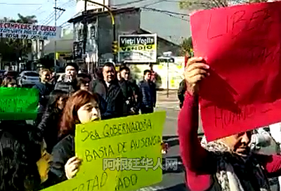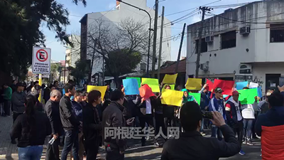 在得到合法批文后,今天中午当地80余中国人及10余名阿根廷邻居共同组织参与了这次援助、挽救中国年轻人的游行活动。