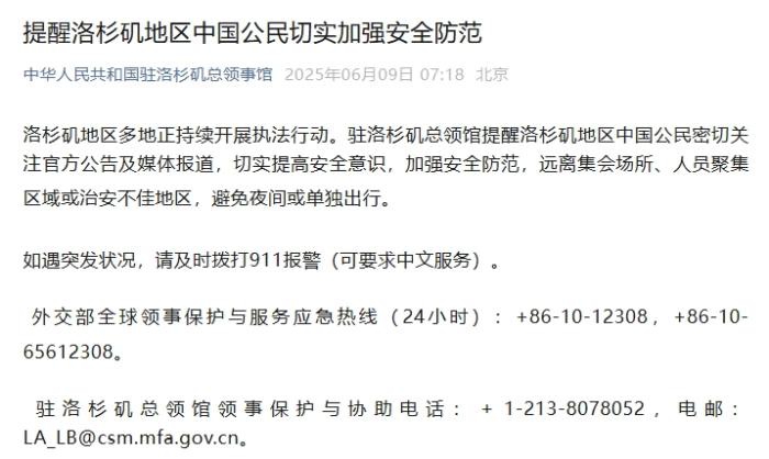 中新网6月9日电 据中国驻洛杉矶总领事馆公众号9日消息,洛杉矶地区多地正持续开展执法行动。驻洛杉矶总领馆提醒洛杉矶地区中国公民密切关注官方公告及媒体报道,切实提高安全意识,加强安全防范,远离集会场所、人员聚集区域或治安不佳地区,避免夜间或单独出行。