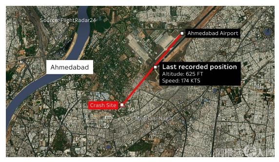 航班追踪网站数据显示,印度航空公司这架飞往伦敦的波音787-8“梦想客机”的信号,在625英尺(约合190米)高度消失,起飞后还不到1分钟。