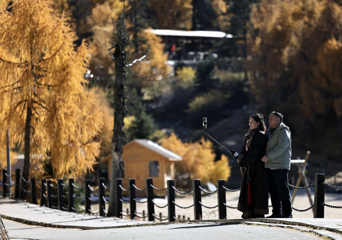木格措,藏语意为“野人海”,是康定情歌的发源地。深秋的木格措,云雾在山谷间游走,湖面清澈如镜,倒映着皑皑雪峰与金黄林海。游客漫步栈道,听风声与水声交织。