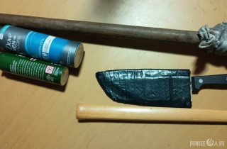 事发不久后,警方在路口逮捕了嫌疑人,并从其身上搜出了所抢物品,还有一把刀具、锤子和一根木棍。