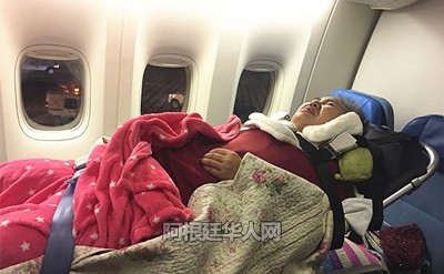 仍处于昏迷状态的李女士被救护车送到机场,登机后被安置在商务舱特设设置,一名医生及家人在旁进行护理。