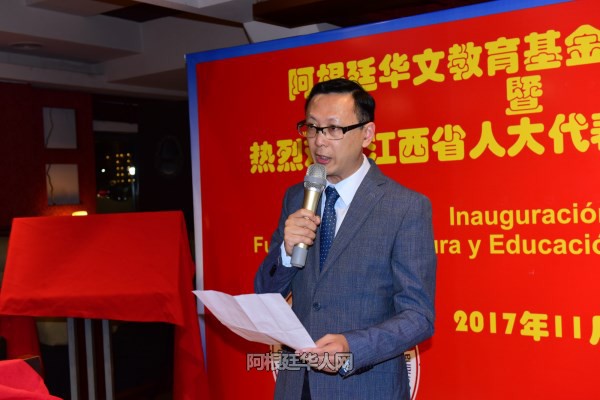中国驻阿根廷大使馆陈志军侨务领事也发表了致辞,他说:“热烈欢迎江西省人大友好访问团来到阿根廷进行友好工作访问。阿根廷华文教育基金会的成立,对旅居在阿根廷的华人子弟来说是一件大好事,通过学习中国文化,让我们的后代拥有一颗中国心,将我们优秀的中华文化传承下去,同时将阿根廷人学习中国文化的工作做好。祝贺阿根廷华文教育基金会的成立,预祝江西省人大友好访问团在阿根廷的工作顺利并取得圆满成果。”
