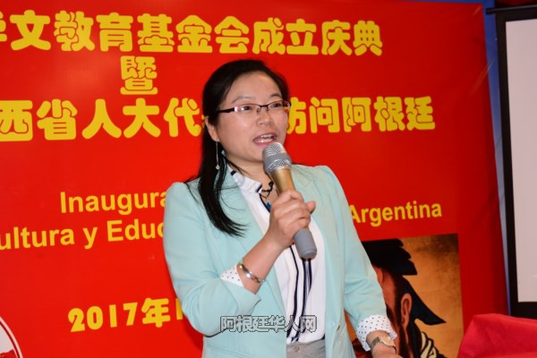 江西省人大友好访问团成员、江西省侨联主席张知明主席致辞,她说:“我受马主任的委托,代表“江西省人大友好访问团”和江西省侨联向阿根廷华文教育基金会的成立表示热烈的祝贺!基金会的成立是阿根廷侨界的一件大事、一件喜事,对于弘扬中华优秀文化,增进中华文化认同感,促进中阿文化交流具有重要意义。