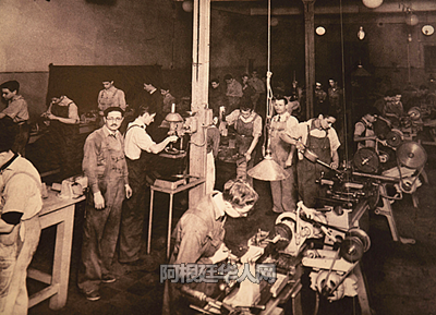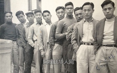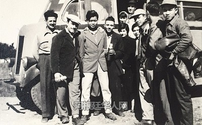 伍志伟的父亲(左二)与工友(1955年)