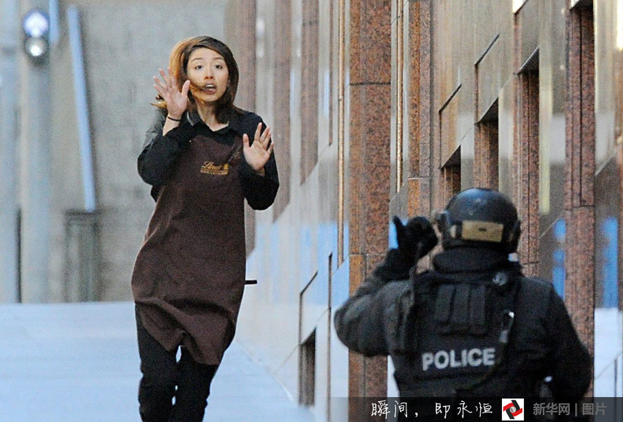 当地时间2014年12月15日,澳大利亚悉尼一家咖啡馆发生人质劫持事件,这是一名人质从劫持现场逃跑出来。