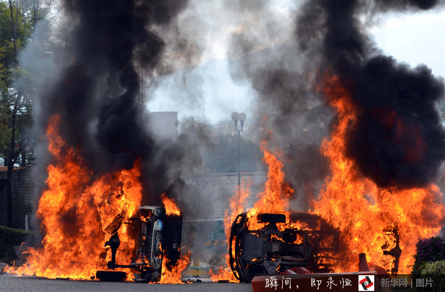 当地时间2014年12月14日,墨西哥示威者放火焚烧车辆抗议。